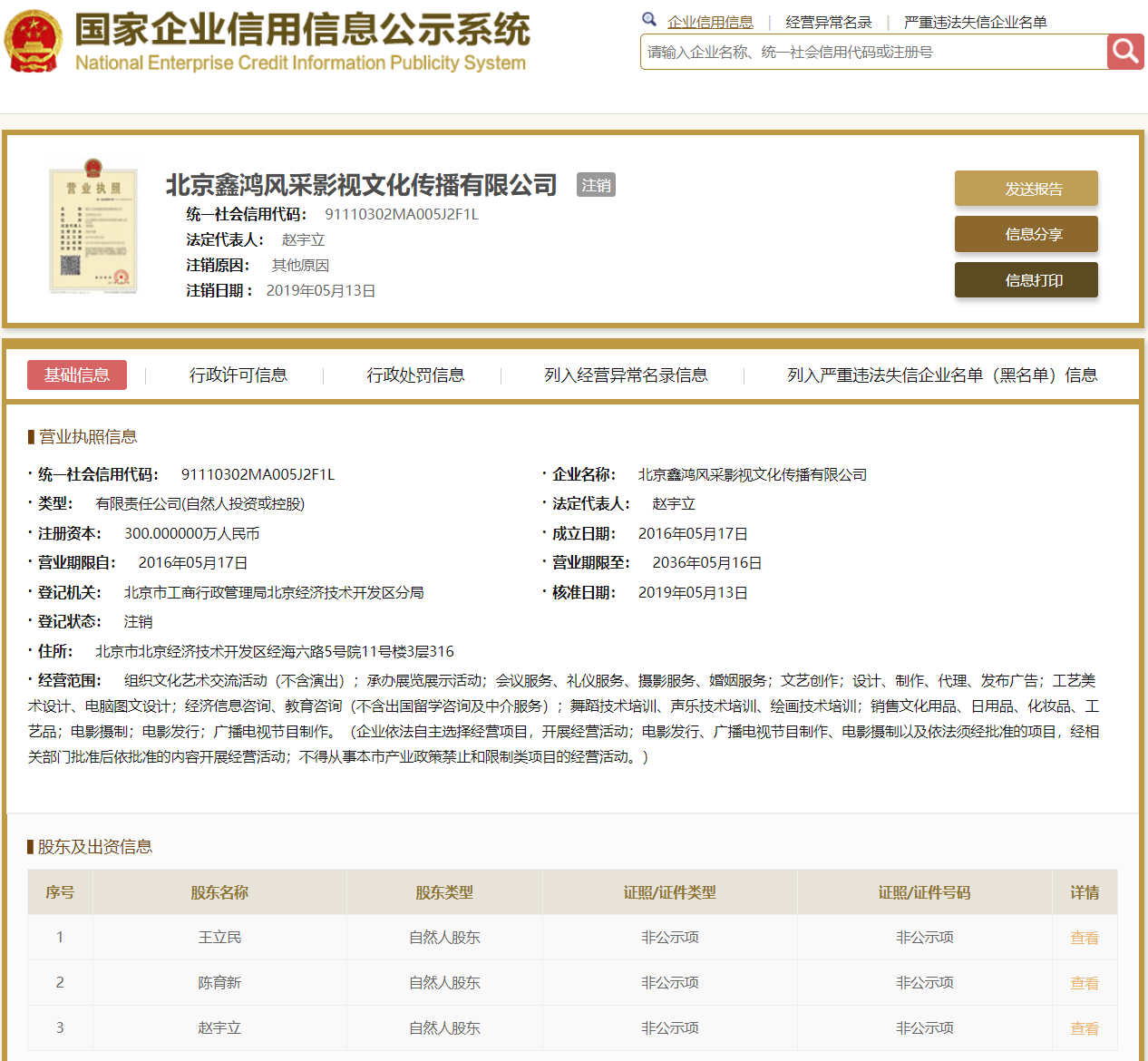 | 经营状态 | 注销 | 法人代表 | 赵宇立 |