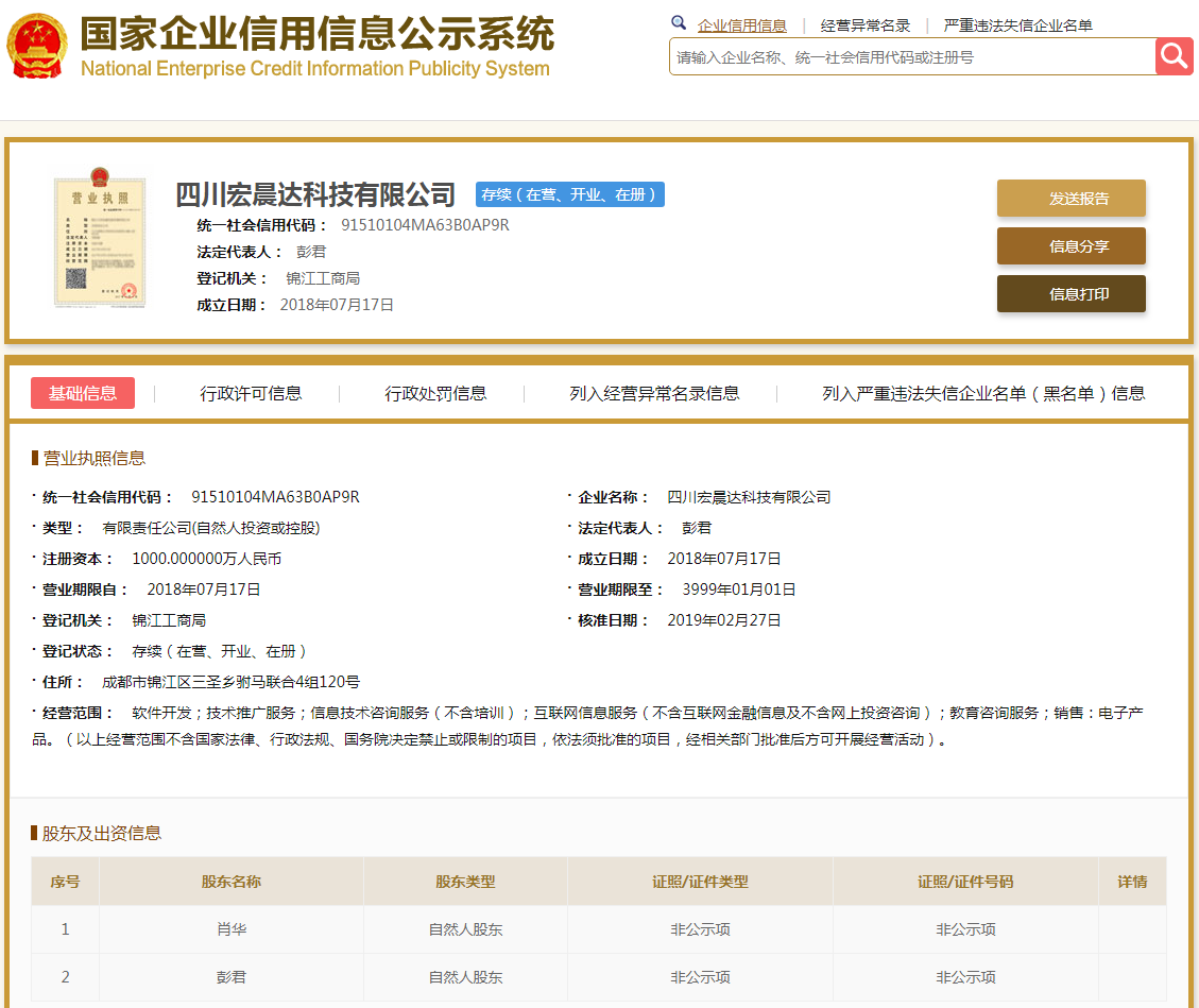 | 公司名称 | 四川宏晨达科技有限公司 | 信用代码 | 91510104MA63B0AP9R |