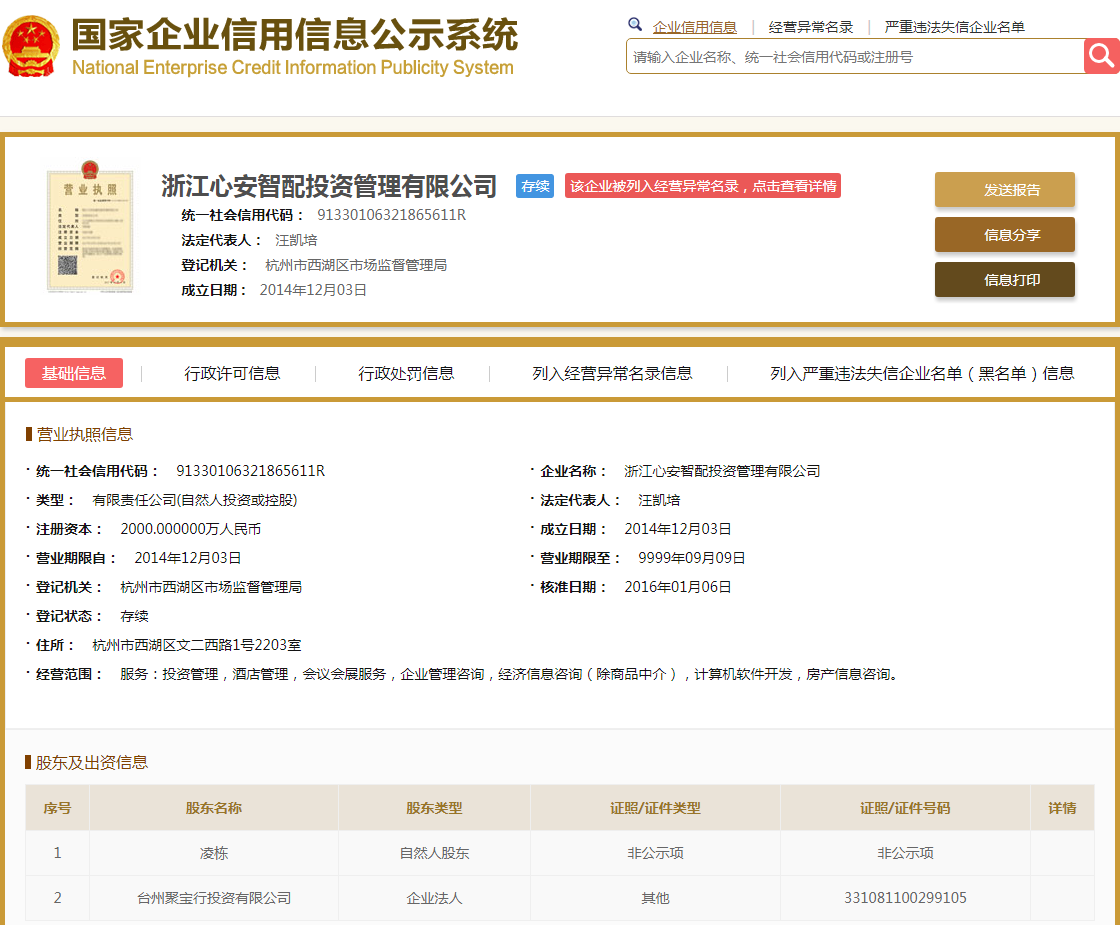 心安智配经营主体“浙江心安智配投资管理有限公司”已被工商部门纳入经营异常名单。