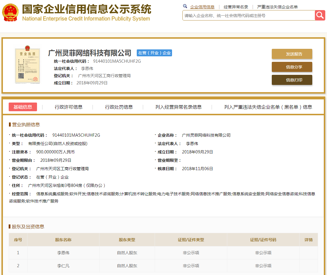| 公司名称 | 广州灵菲网络科技有限公司 | 信用代码 | 91440101MA5CHUHF2G |