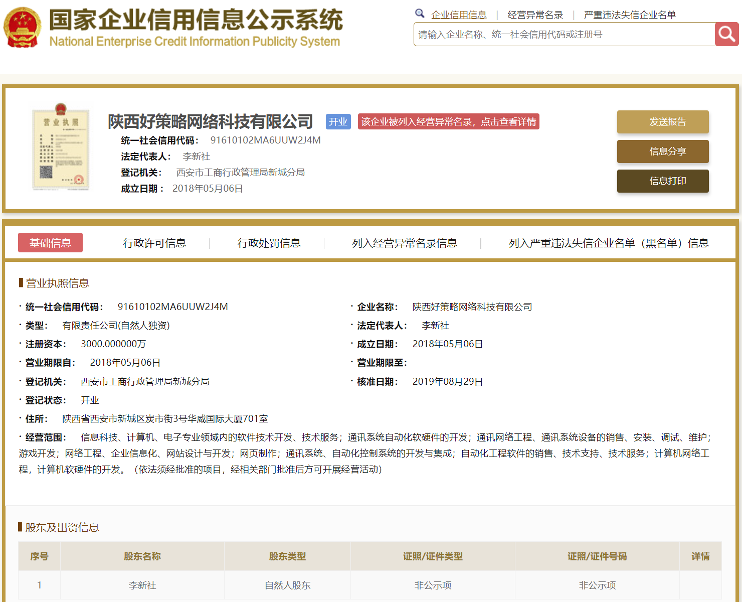 | 公司名称 | 陕西好策略网络科技有限公司 | 信用代码 | 91610102MA6UUW2J4M |