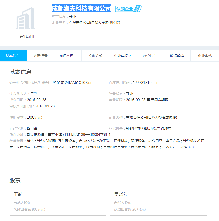 | 公司名称 | 成都渔夫科技有限公司 | 信用代码 | 91510124MA61XT0755 |