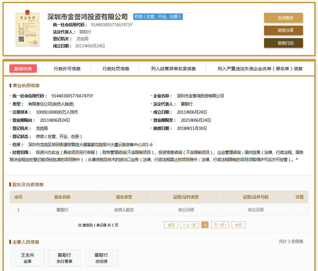 | 公司名称 | 深圳市金誉鸿投资有限公司 | 信用代码 | 91440300577667475Y |