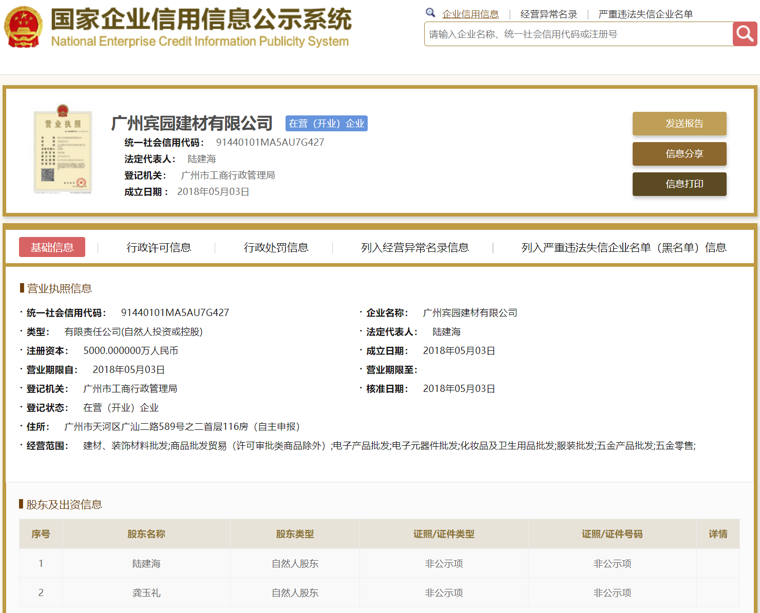 | 公司名称 | 广州宾园建材有限公司 | 信用代码 | 91440101MA5AU7G427 |