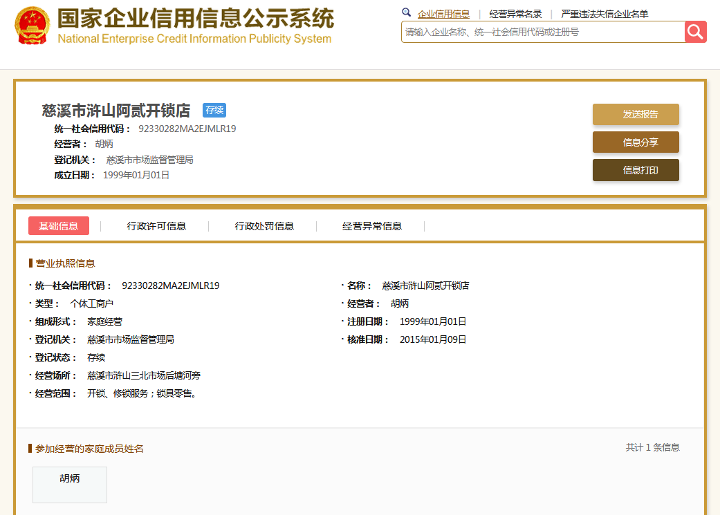 | 公司名称 | 慈溪市浒山阿贰开锁店 | 信用代码 | 92330282MA2EJMLR19 |