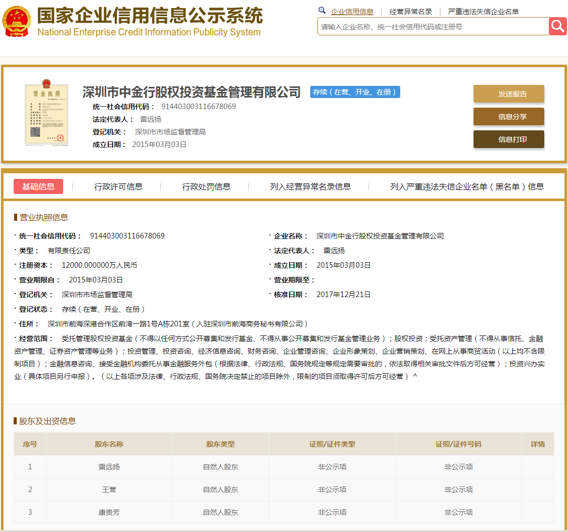 | 公司名称 | 深圳市中金行股权投资基金管理有限公司 | 信用代码 | 914403003116678069 |