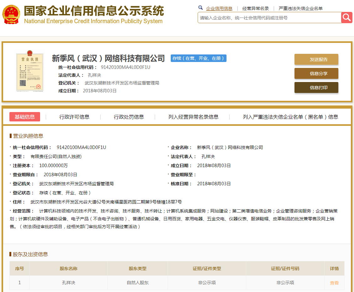 | 公司名称 | 新季风(武汉)网络科技有限公司 | 信用代码 | 91420100MA4L0D0F1U |