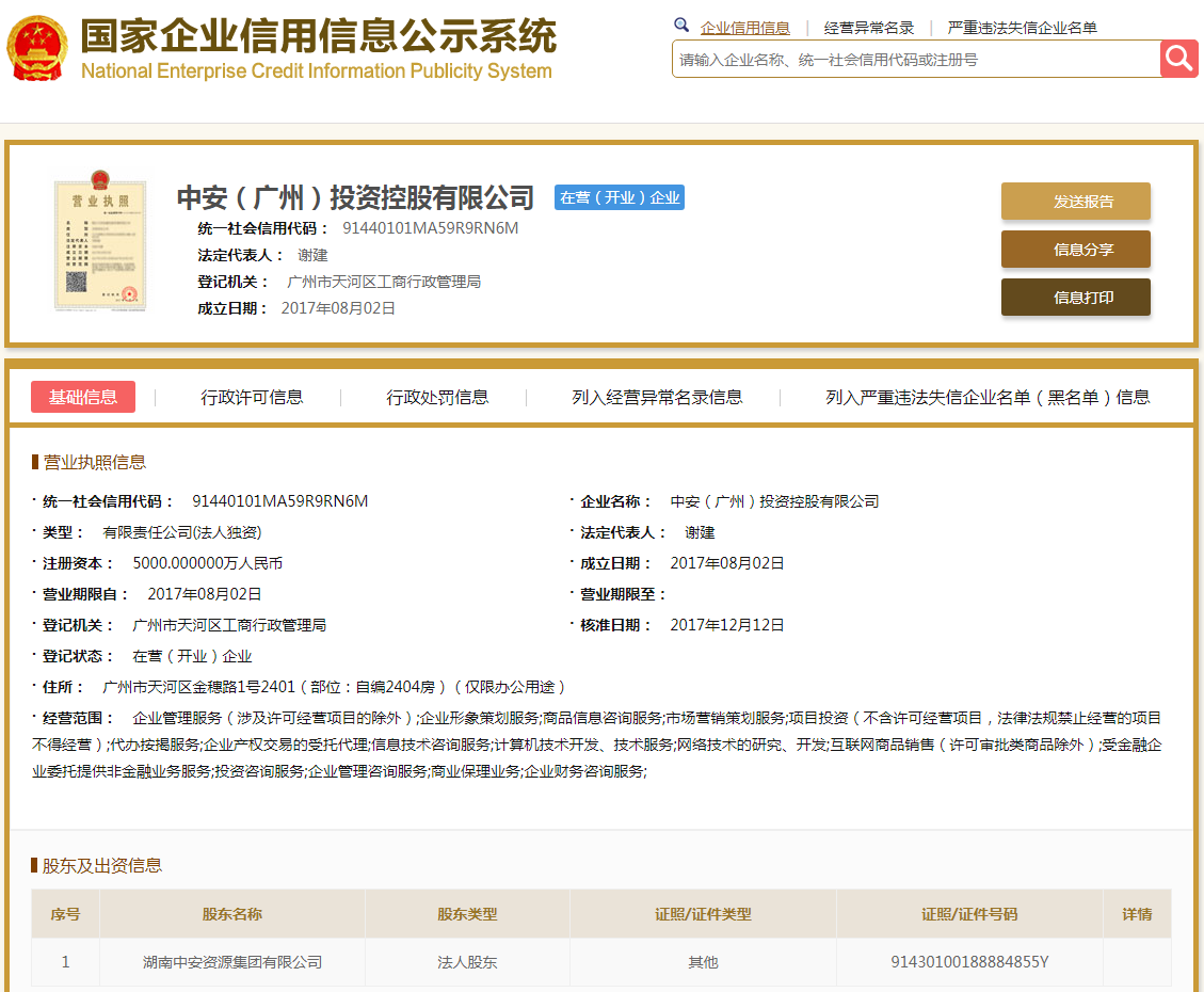 | 公司名称 | 中安(广州)投资控股有限公司 | 信用代码 | 91440101MA59R9RN6M |