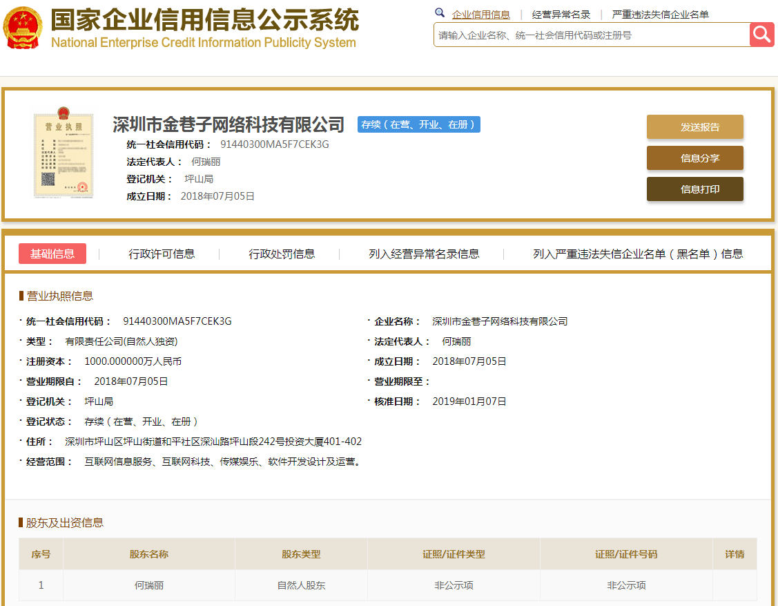 | 公司名称 | 深圳市金巷子网络科技有限公司 | 信用代码 | 91440300MA5F7CEK3G |