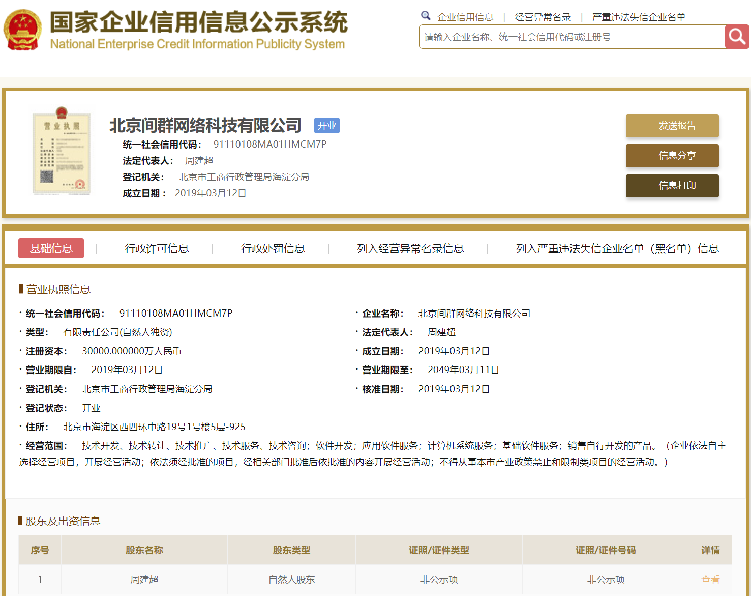 | 公司名称 | 北京间群网络科技有限公司 | 信用代码 | 91110108MA01HMCM7P |