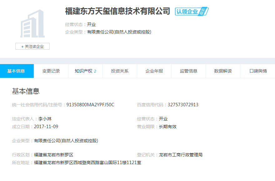 | 公司名称 | 福建东方天玺信息技术有限公司 | 信用代码 | 91350800MA2YPFJ50C |