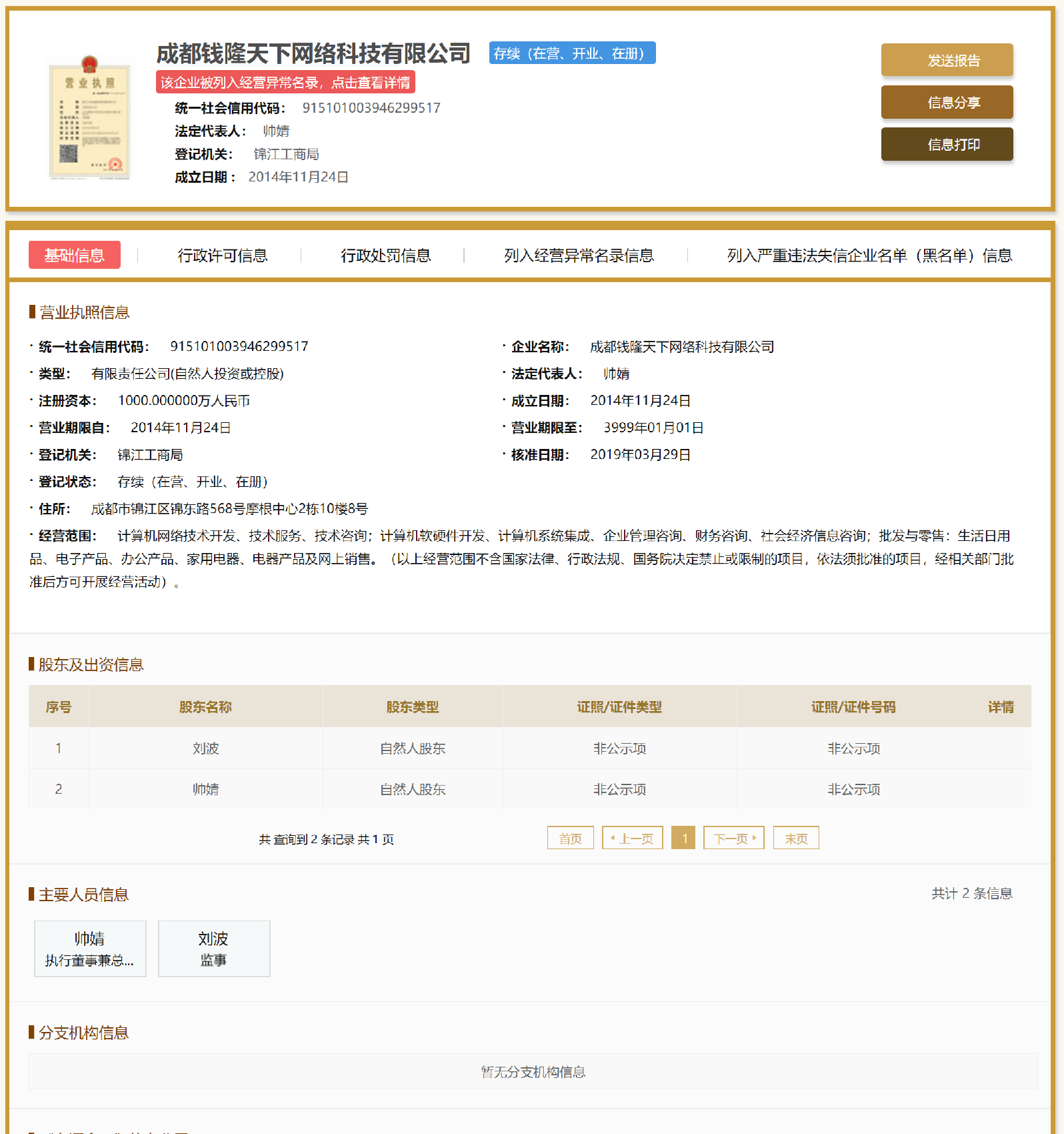 | 公司名称 | 成都钱隆天下网络科技有限公司 | 信用代码 | 915101003946299517 |