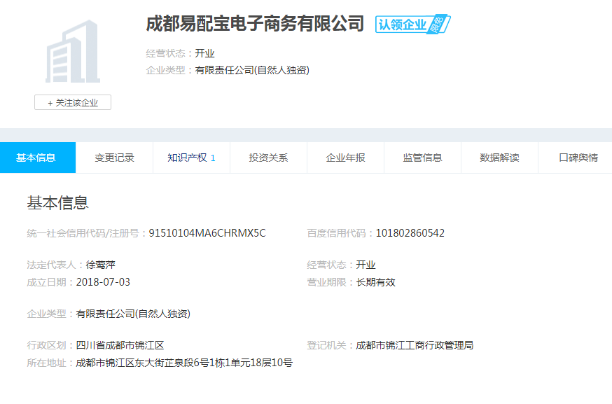 | 公司名称 | 成都易配宝电子商务有限公司 | 信用代码 | 91510104MA6CHRMX5C |