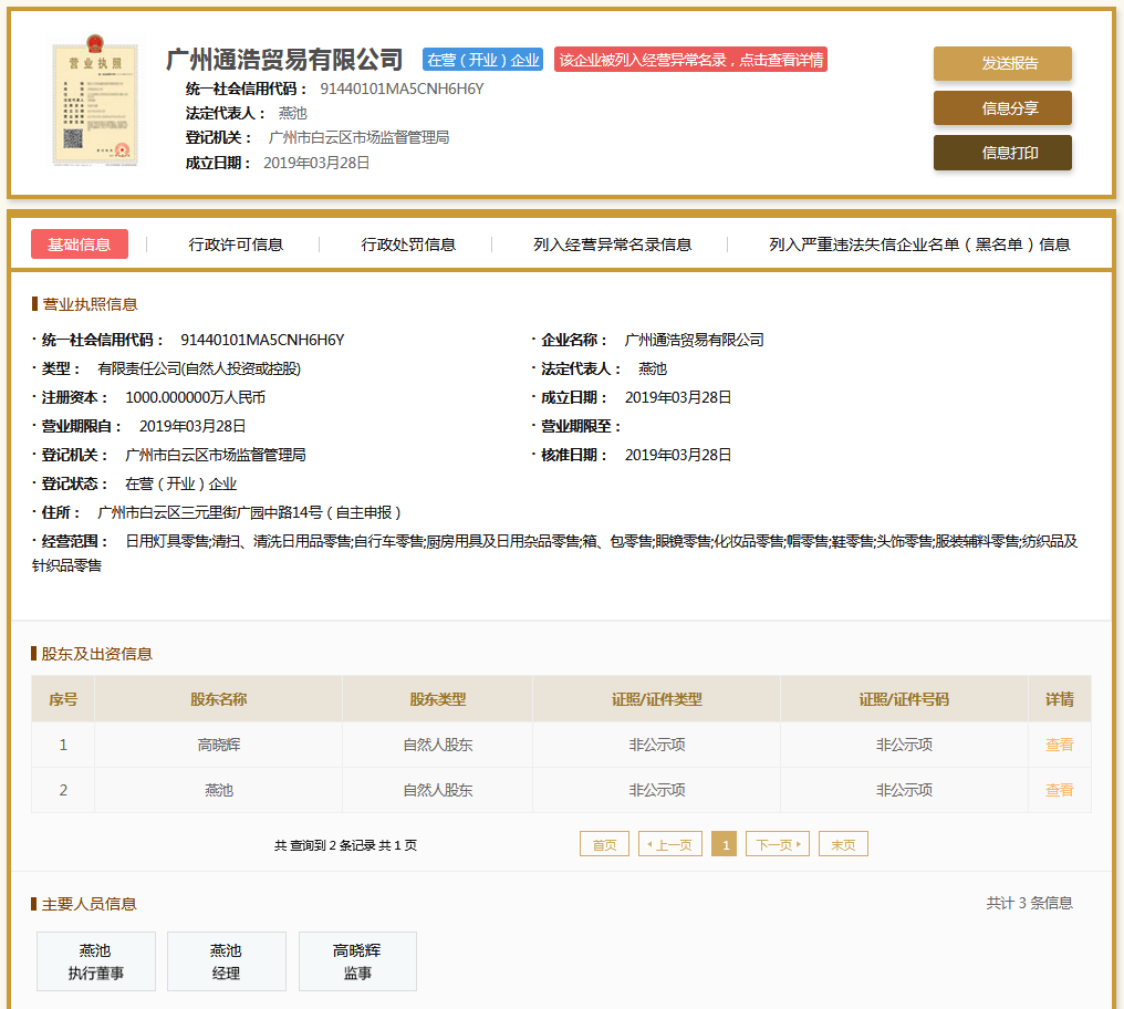 | 公司名称 | 广州通浩贸易有限公司 | 信用代码 | 91440101MA5CNH6H6Y |