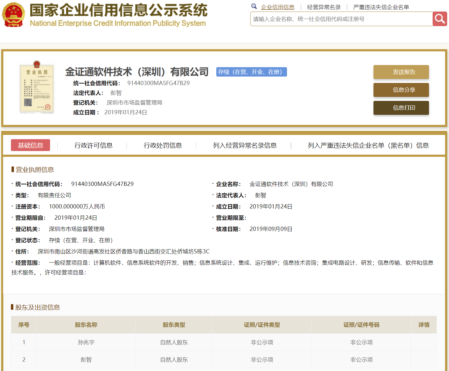 | 公司名称 | 金证通软件技术(深圳)有限公司 | 信用代码 | 91440300MA5FG47B29 |