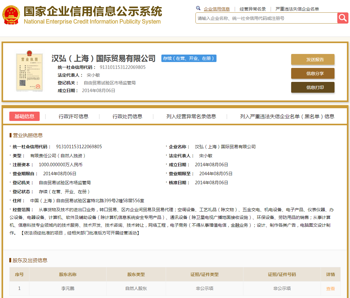 | 公司名称 | 汉弘(上海)国际贸易有限公司 | 信用代码 | 913101153122069805 |